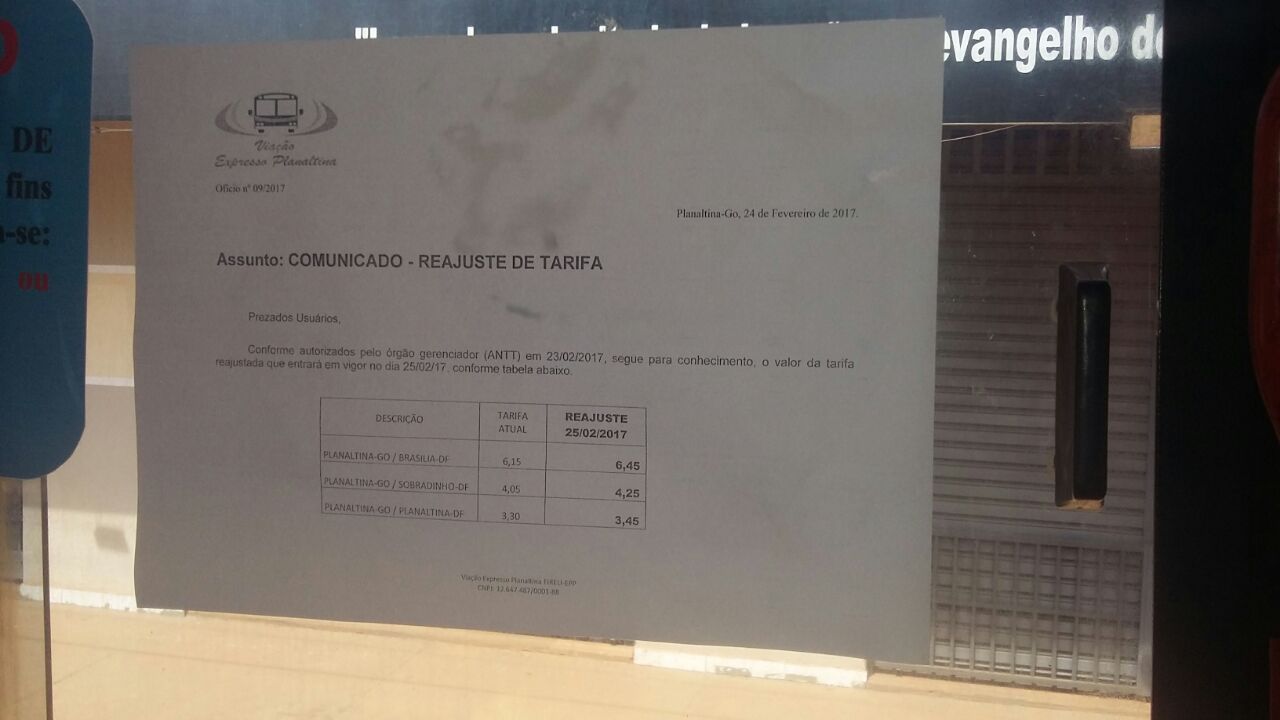 A empresa Expresso Planaltina já divulgou nos ônibus a nova tabela de preços.