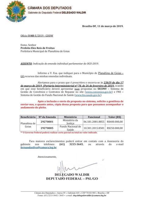 O Deputado Federal Delegado Waldir (PSL-GO) que obteve milhares de votos em Planaltina Goiás, atendeu à um pedido do Delegado Cristiomário e destinou um montante de R$ 650.000 em emendas para beneficiar a cidade.
