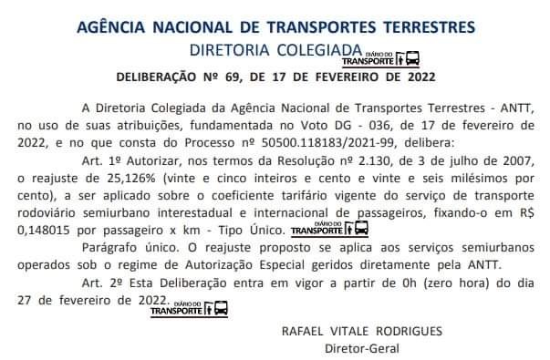 A ANTT (Agência Nacional de Transportes Terrestres) publicou nesta sexta-feira, 18 de fevereiro de 2022, no Diário Oficial da União, a Deliberação 69 que autoriza o reajuste de 25,126 % nas tarifas de ônibus semiurbanos de linhas interestaduais e internacionais operadas por meio de autorização especial.