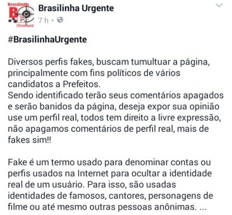 Em resposta, a página ‘Brasilinha Urgente’ se defendeu e explicou porque está apagando os comentários e bloqueando os usuários que ‘tumultuam’ a página com fins políticos: