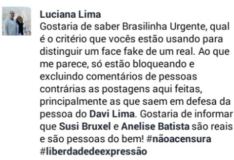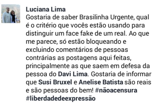 Quem também se manifestou foi a esposa do ‘Dr. Davi’, Luciana Lima, ela diz que a página estaria supostamente excluindo e bloqueando usuários que defendessem principalmente o marido dela, o médico David Lima.