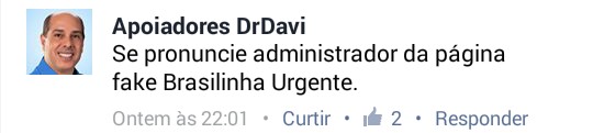 Em outro comentário, um perfil de uma pessoa com o nome ‘Apoiadores DrDavi’ que também faz vários comentários em redes sociais, escreveu:
