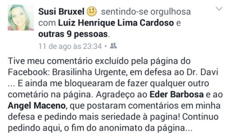 Susi Bruxel, postou em uma conta na rede social a sua indignação. Na publicação, ela se mostra inconformada com o ocorrido, já que não pode mais comentar na página e foi confundida como fake: