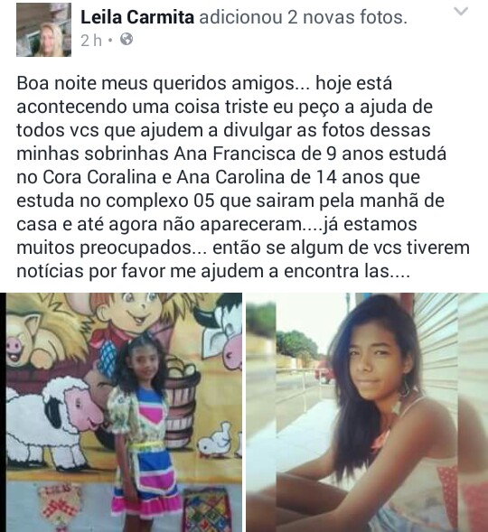 [ENCONTRADAS] A Tia das meninas, Leila Carmita, conta em uma rede social, que as sobrinhas dela, Ana Francisca de 9 anos e Ana Carolina de 14, sairam pela manhã e não deram mais notícias. Ana Francisca estuda na Escola Municipal Cora Coralina, e Ana Carolina estuda no Colégio Estadual Complexo 05. As garotas moram na Quadra 02 Norte de Planaltina Goiás. Ajude a localiza-las.